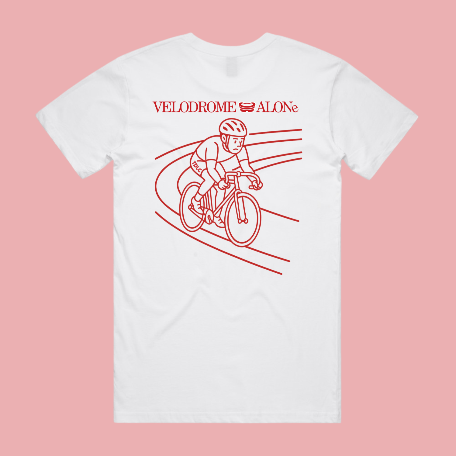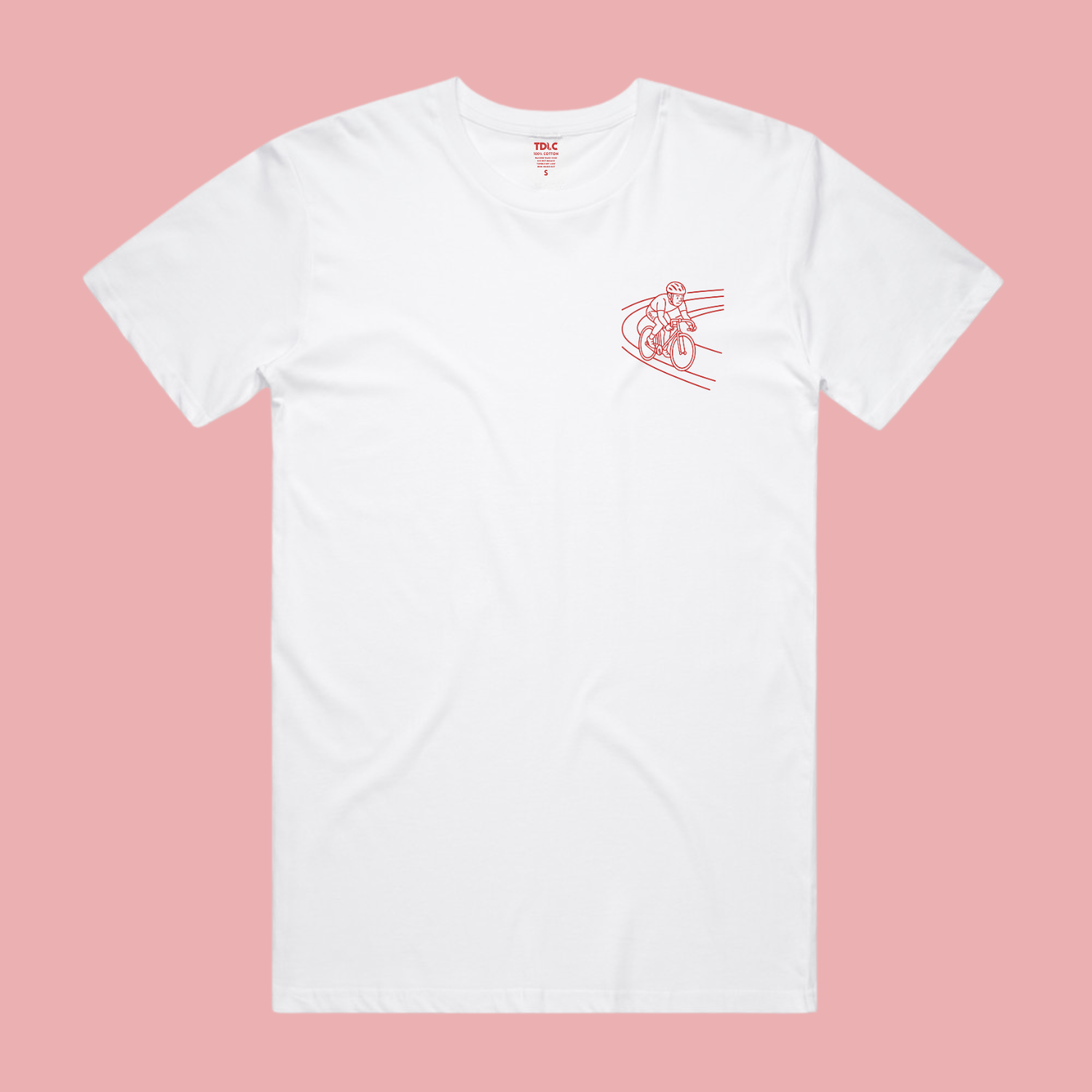 Printed in bold red on soft white cotton, the design features a clean line-art illustration of a lone track rider in full flight, minimal, timeless, unmistakably TDLC.