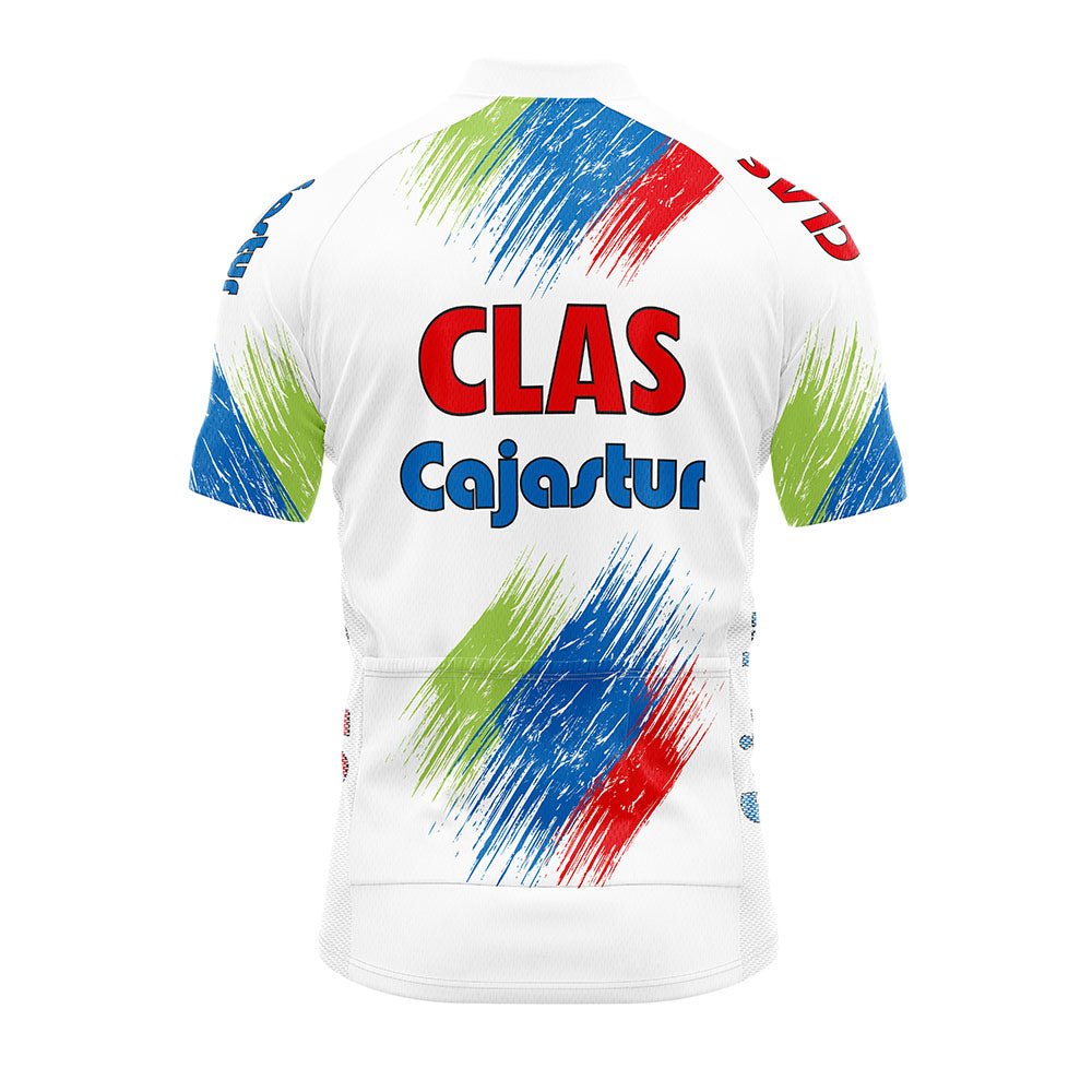 Maillot ciclista retro CLAS Cajastur usado por el equipo ciclista profesional español que compitió entre 1988 y 1993. El ciclista más famoso del equipo, Tony Rominger, ganó la clasificación general de las carreras de la Vuelta a España de 1992 y 1993, además de la París-Niza de 1993.
